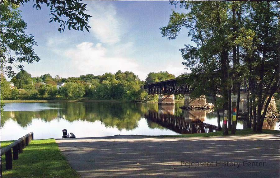 A color picture postcard of the Pejepscot Paper Co. Mill and the little park on the Brunswick side of the River. (The name of the park is unknown to this author).