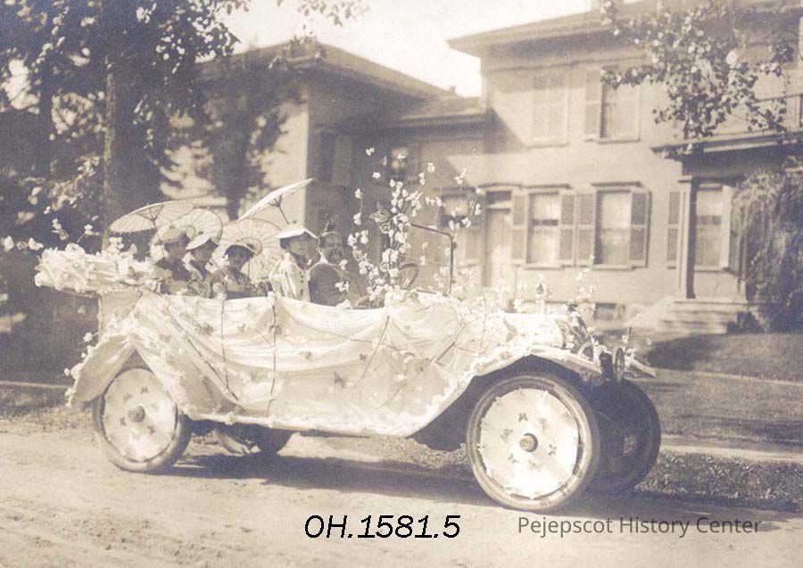 Note: This item contains depictions of offensive racial stereotypes. Car Winning First Prize for Autos - under 116 inch wheelbase. Driver Harry W. Varney. Driver and others in car wearing Asian costumes (possibly Japanese) and carrying parasols. Photo is not dated.
