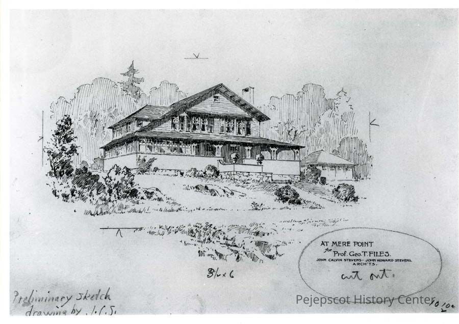 Black & white photograph of a preliminary sketch of the Professor George T. Files Cottage at Mere Point by John Calvin Stevens, Architect, Portland, ME.