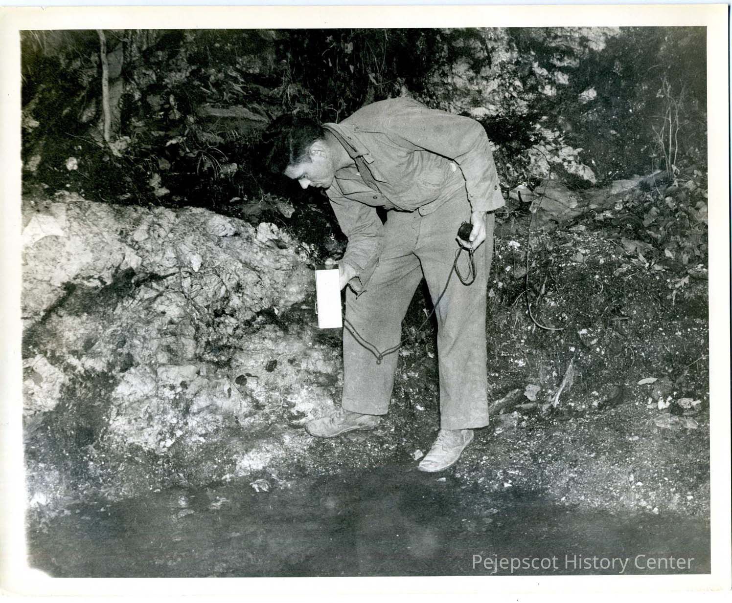 Professor Jim Moulton, a Bowdoin biologist, is shown recording fish sounds. Undated