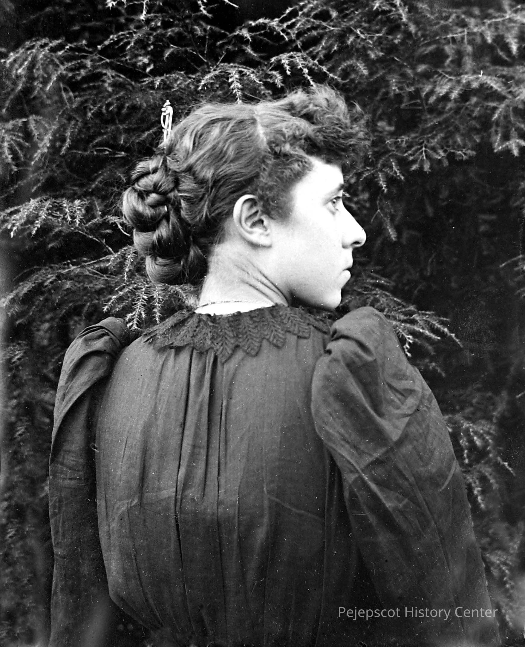 A glass plate negative with a photograph of the profile of an unknown woman with her back to the camera. "CD-R "Glass Negs #2" #59 Undated.