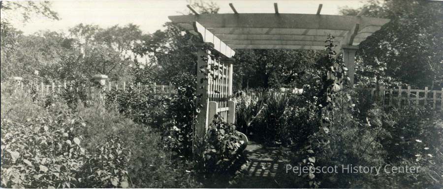 A B/W photograph of Prudy Morrell's garden at 173 Park Row, Brunswick. ME. The photograph is taken from a slight angle of the path towards the pergola. Dated c. 1930.