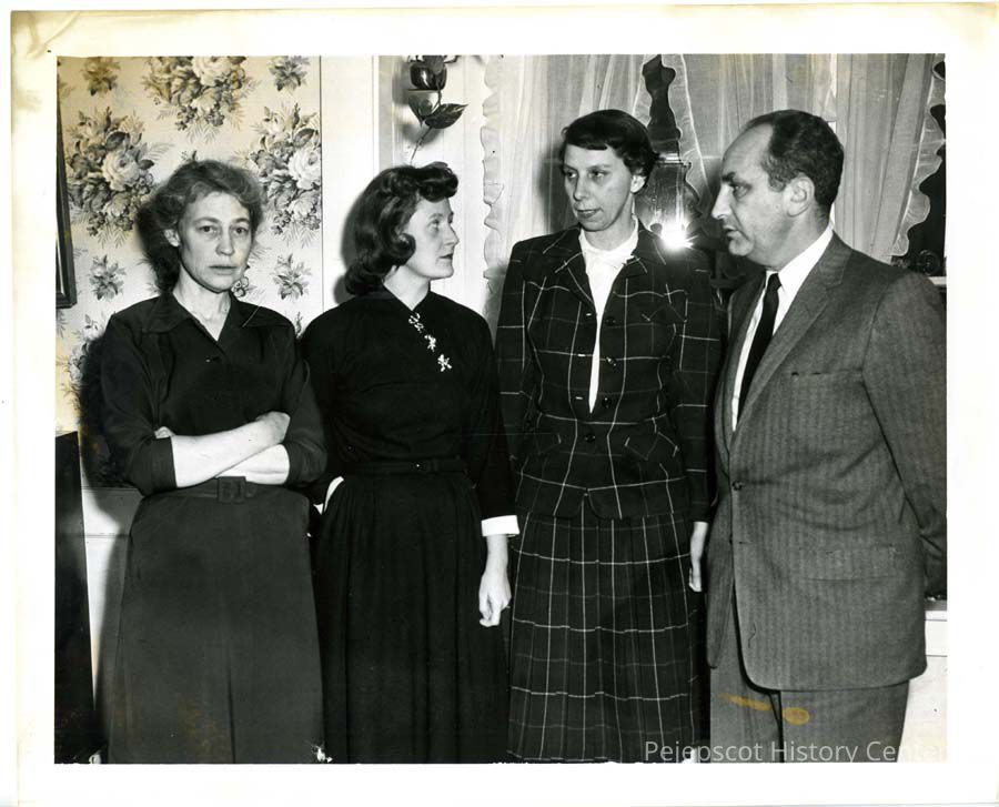 Black and white photograph of a Public Health meeting at the home of Mrs. Wilson, 82 Federal Street, Brunswick. Among those pictured are Mrs. Elizabeth Wilson and Eleanor Irish, R.N. Undated