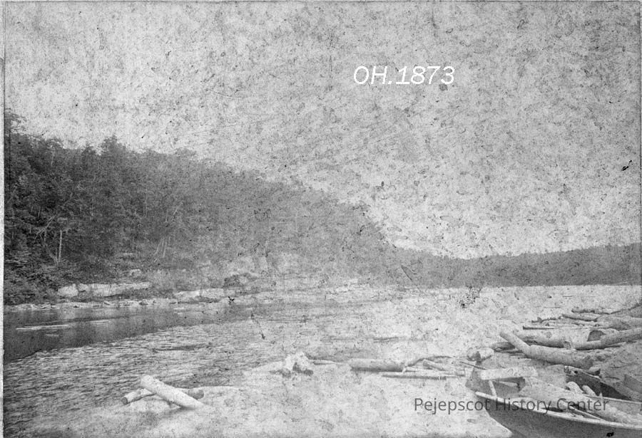 A B/W photograph of pulp logs on an unknown river. Possibly the Kennebec River. Not dated.