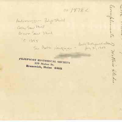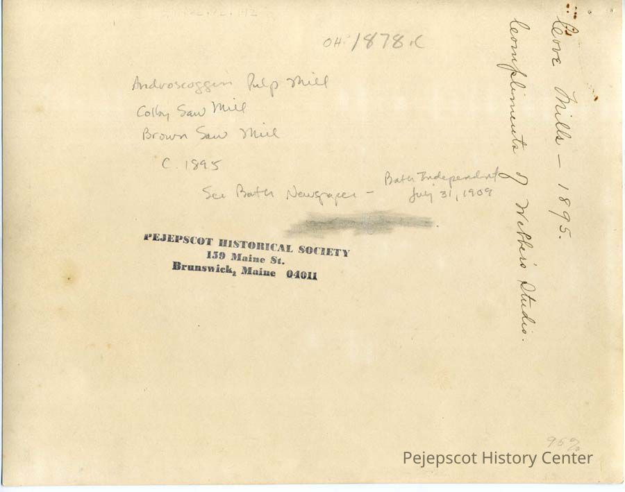 A B/W photograph of the cove and sawmill on the Androscoggin. Marked on the back, "Androscoggin Pulp Mill, Colby Sawmill, Brown Sawmill, ca. 1895."