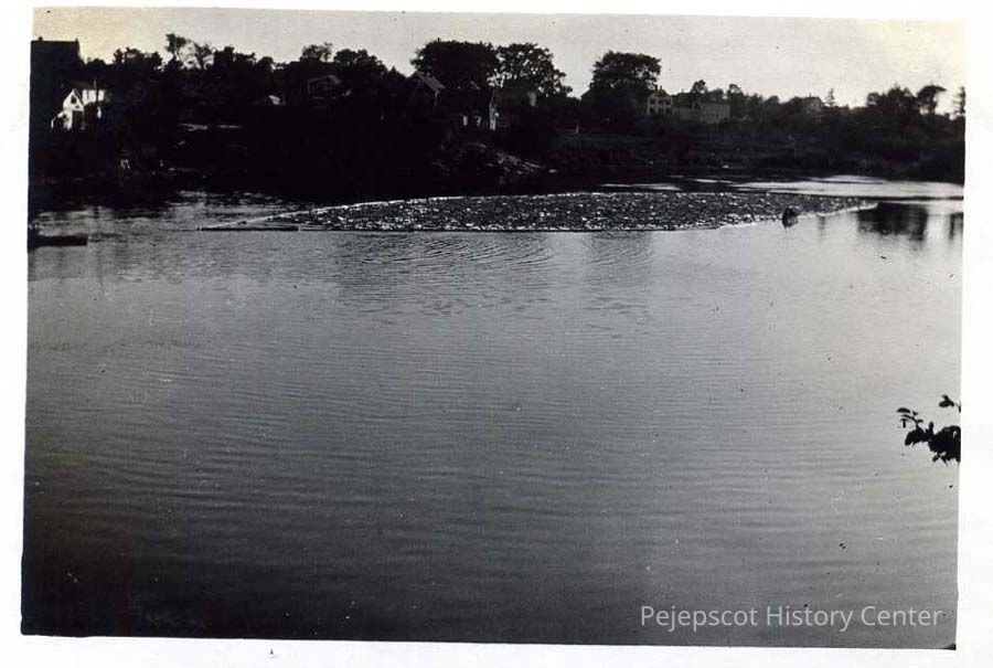 B/W photo of pulpwood on the Androscoggin River from upper Mill Street. Around 1922.
