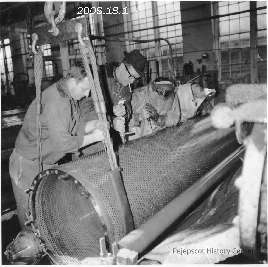 A B/W photograph of some work men drilling out the holes in a suction press roll. Two of the men are identified, they are James Bartlett and Harry Walker, Jr..