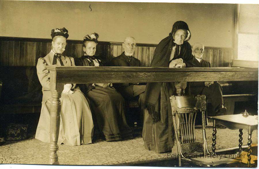 A B/W photo postcard of a Quaker meeting. Information on back identifies Emma Newell, 2nd from left, and Mary Goddard (100 years old), standing. Undated.