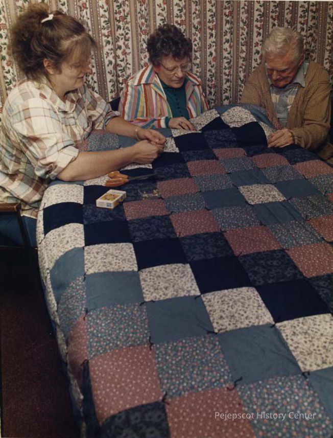 A color photograph of three people working on a patchwork quilt. They are identified as Debbie Billantoni (left), Grace Ciccone (middle), and Delbart Smith (right). They are all sat at the end of a table with the quilt laid out flat working on the edge. The pieces featured are floral and shades of blue in the same pattern expanding from a single white floral patch outward. This photo was published in the Times Record on 09/27/1988.