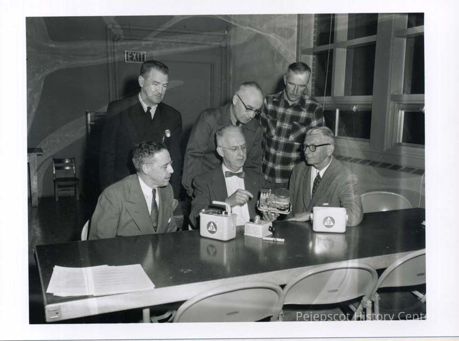 B/W photo of 3 men sitting at a table and 3 men looking on at a contraption used at a course on radiological defense - Ernest Sylvester is one of the men standing, black suit.