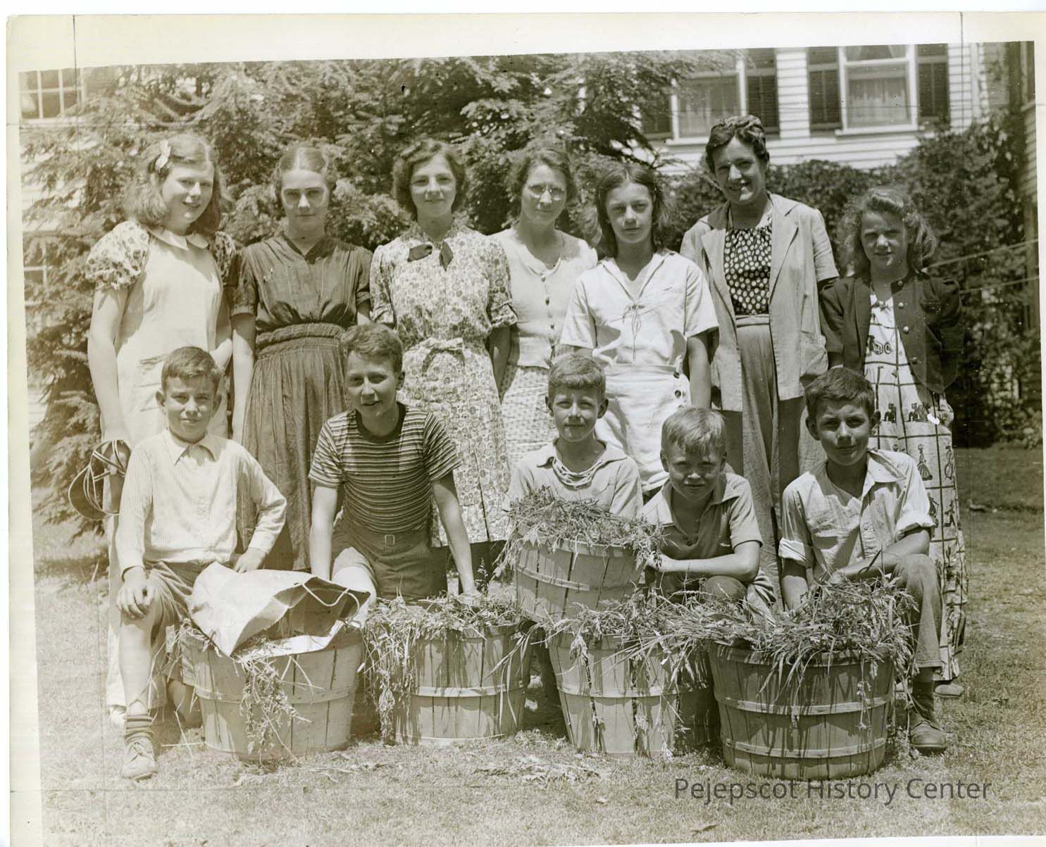 A photo of five boys kneeling behind baskets of ragweed with six girls and one woman standing behind them. The caption reads "ragweed pickers." Undated