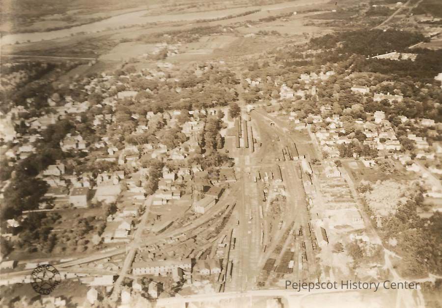 A B/W aerial view of Brunswick, the rail yard and the Lower Androscoggin River. The postcard is unused. Undated
