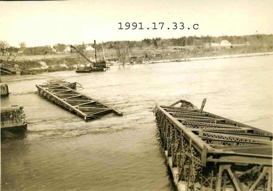 A black and white photograph of the Brunswick Topsham Railroad Bridge in the aftermath of the 1936 flood. Pieces of the bridge can be seen laying in the river. A barge with a crane mounted on it is near the Topsham shore. The piers that had supported the bridge can be seen along the left edge of the photograph. The photograph was taken from the Brunswick side of the river, upstream of the bridge.