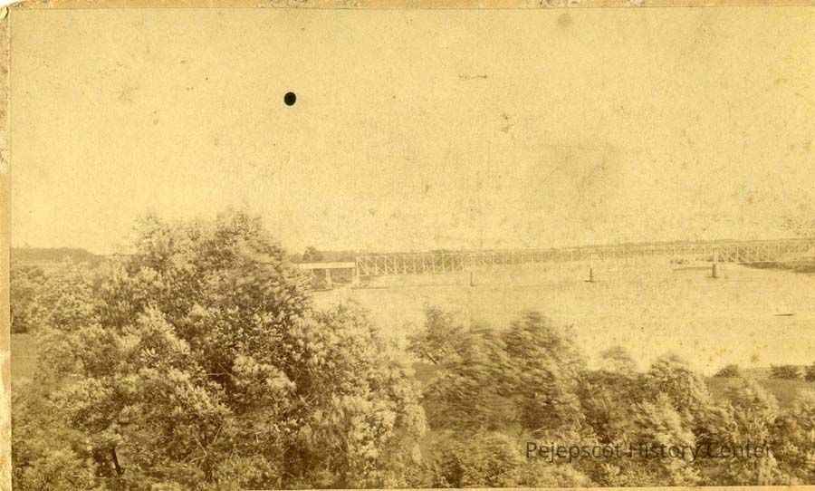 Mounted sepia photograph, very faded, of the railroad bridge between Topsham and Brunswick, taken from up river.