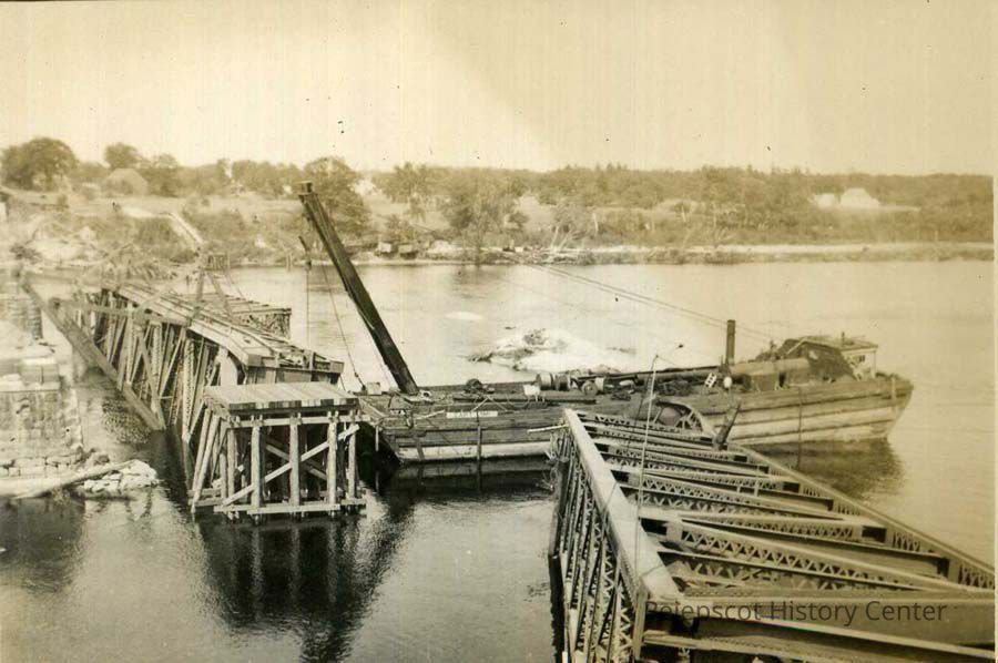 A black and white photograph of repairs to the flood-damaged lower Brunswick Topsham Railroad Bridge in 1936.