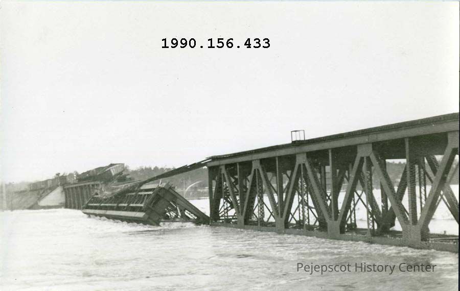 A B/W photograph of the lower railroad bridge as it was being washed away. 1936 This is a duplicate of; 1977.51.191.g 1991.60.5.c 1990.156.312