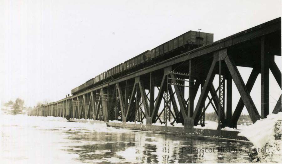 A B/W photograph of the Railroad Bridge before it was washed away by the 1936 flood. The railroad cars were parked on it to help stabilize it. Undated