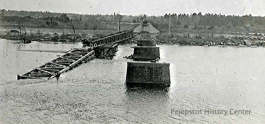 A B/W photograph of a destroyed railroad bridge after the 1936 flood.