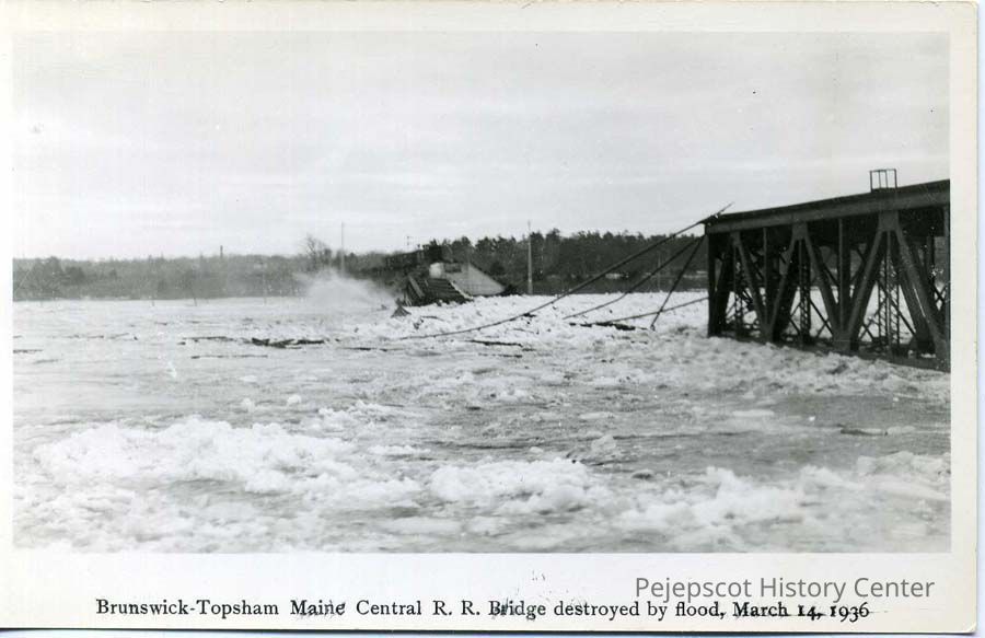 A black and white postcard of the Maine Central Railroad Bridge being destroyed in the 1936 flood on March 14.
