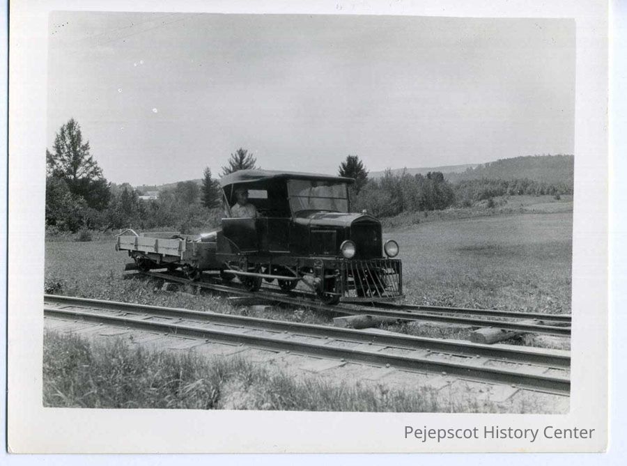 B/W photo of a makeshift railroad car - an old Ford with a cowcatcher and railroad wheels - on a siding.