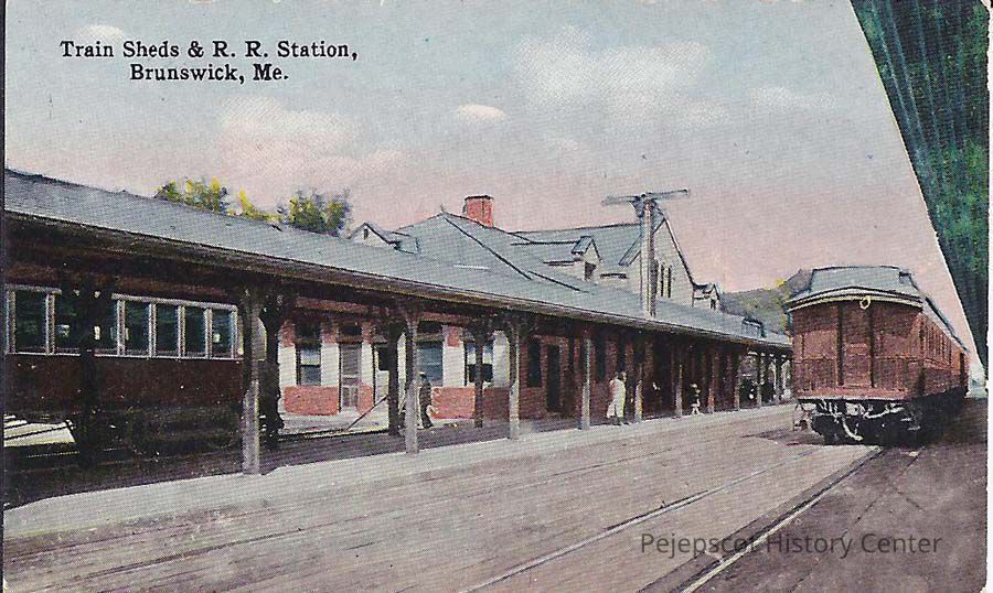A colored miniature postcard view of R.R. Station Brunswick. Undated