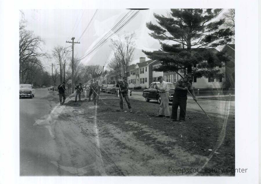 B/W photo of 7 men raking on the strip in front of the Bowdoin Court apartments, upper Maine St. Brunswick.