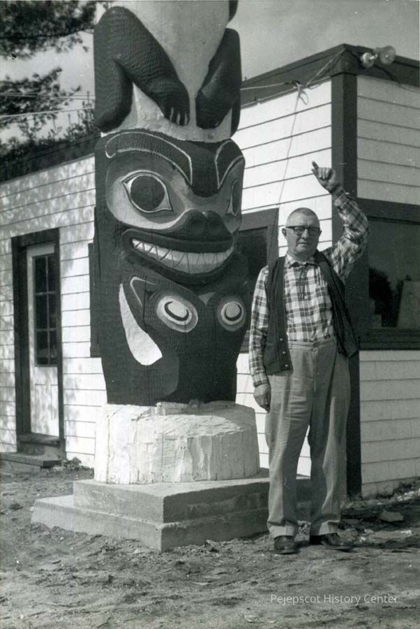 B/W photo of Randall Atwater Sr. of Topsham standing by a totem pole. No date.