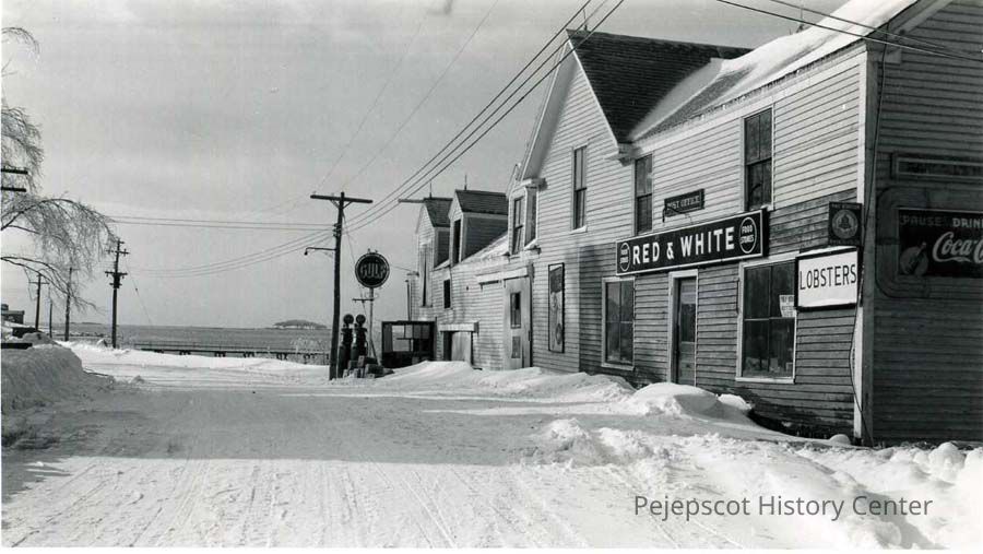 A black and white photo of South Harpswell, Maine in the winter, most likely from January 1947. Randall's store is on the left.