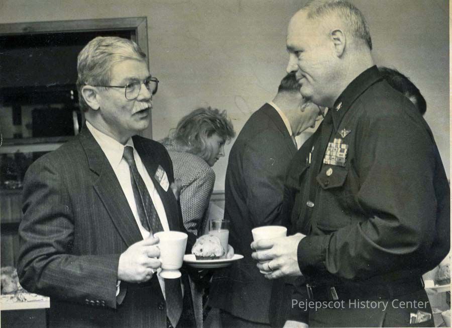 B/W photo of Ray Farrell (Brunswick Chamber president-elect) and Capt. Bruce Darcey, Commanding Officer of Brunswick Naval Air Station. 1991