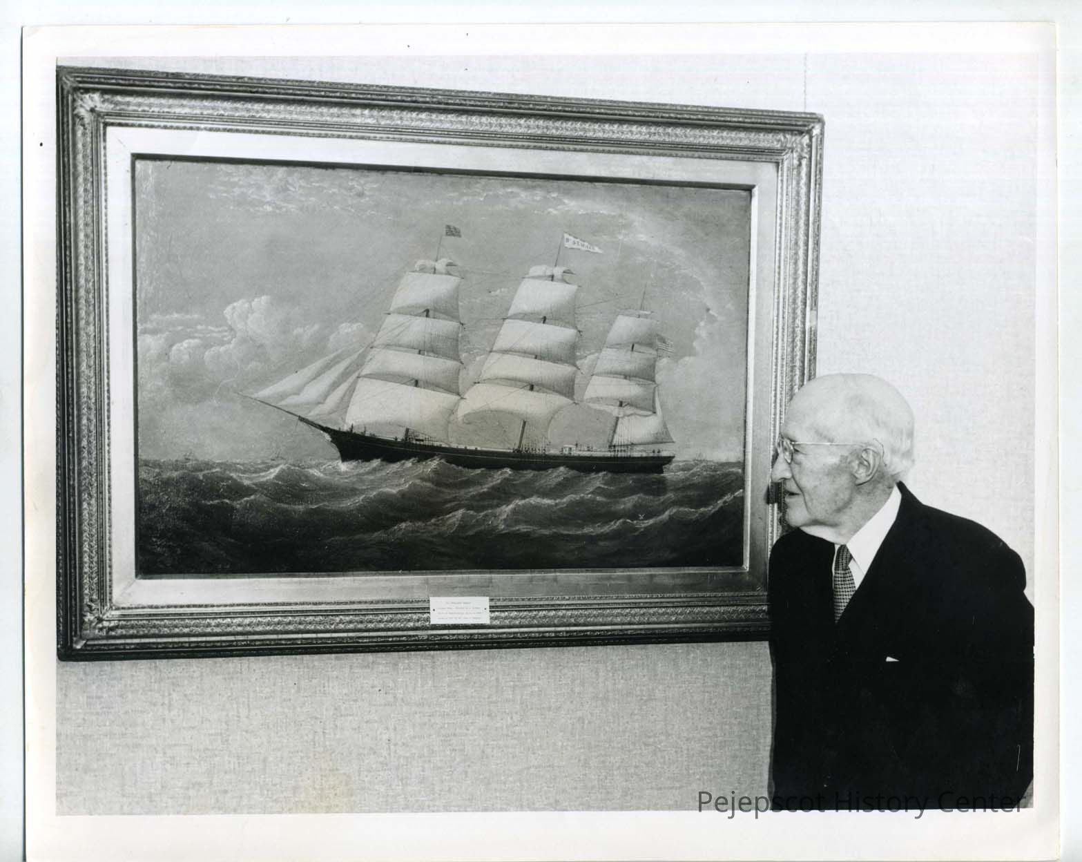 Ray Merriman stand beside a ship painting he donated to the Pejepscot Historical Society. Undated