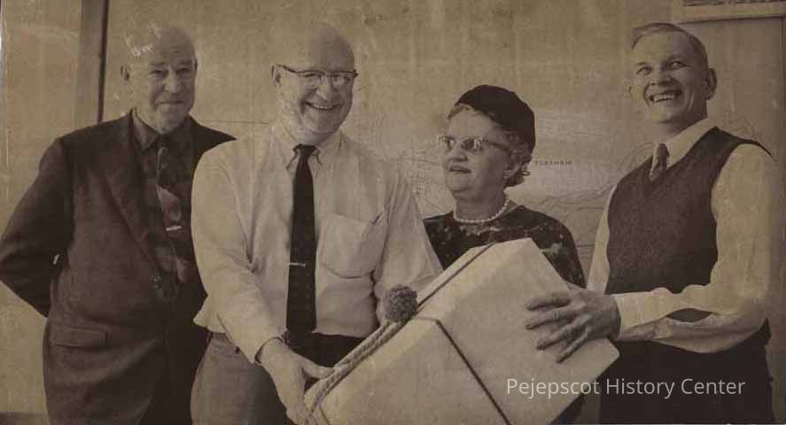 An undated black and white photograph of Raymond Charron, second from left, and three unidentified people. Written on the back is "he is upward bound."