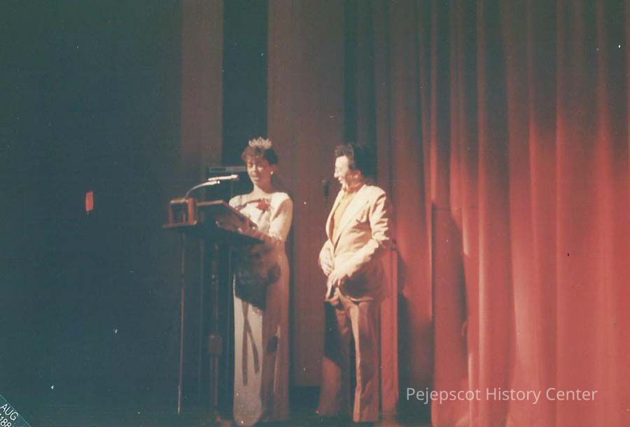 A color photograph of Sharon reading the Pageant Award to Richard Gagne.