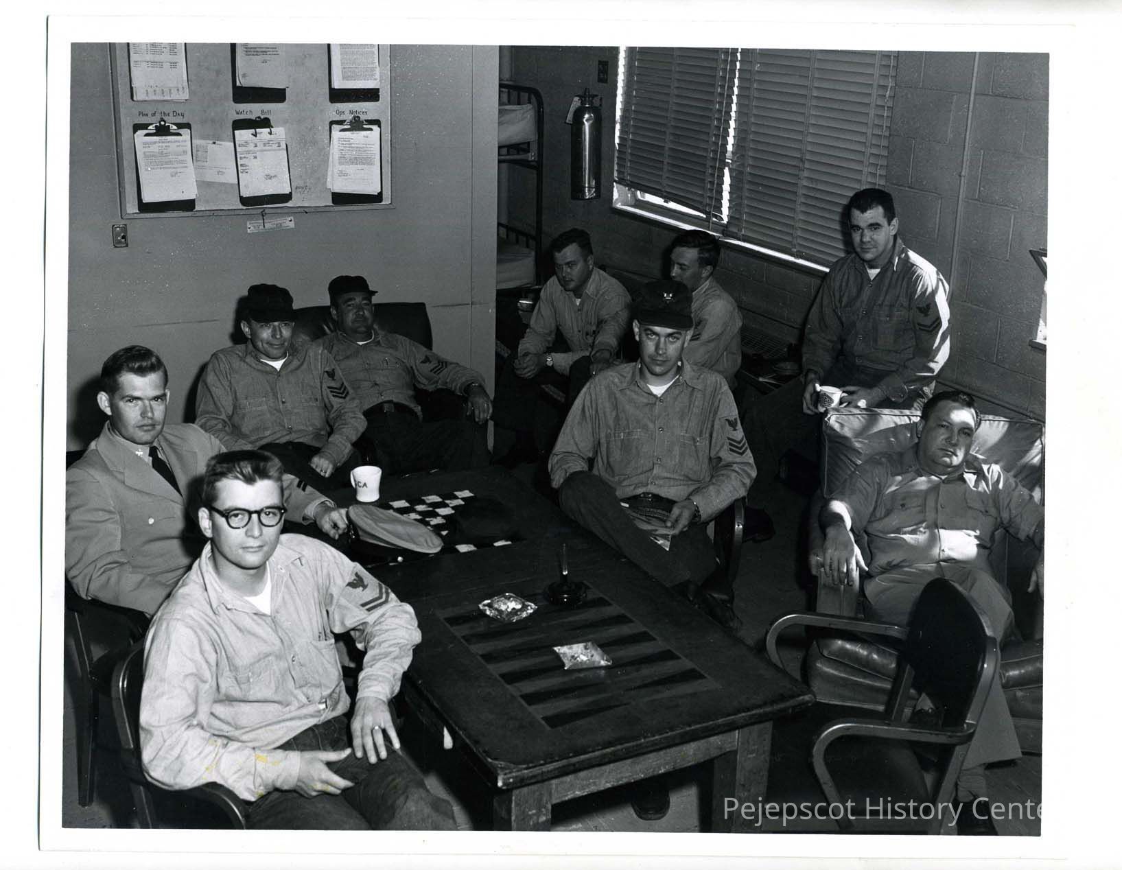 "Sitting around the Ready Room table where the duty selection awaits the alert to man their unit are (clockwise); Dempsey Hargraves, AC2; Raymond Chastain, ACC; Warren Poole, AC1; Herbert Clark, AC1; Thomas Dunn, RD1; Robert Friese, EN2; Albert Laliberte, RD2; Kent Long, AC1 (at table); and John McElligott, RDC (seated in arm chair)." The back is stamped "BNAS NAVAL AIR STATION BRUNSWICK, MAINE, OFFICIAL U.S. NAVY PHOTOGRAPH NOT FOR PUBLICATION UNLESS OFFICIALLY RELEASED and RELEASED IF PUBLISHED CREDIT MUST BE GIVEN AS FOLLOWS '"OFFICIAL PHOTOGRAPH U.S. NAVY.'" UndatedLexicon
