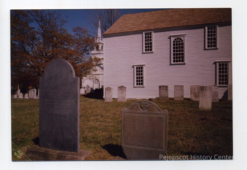 Photo showing view of rear facade, Harpswell Meeting House, over graveyard.