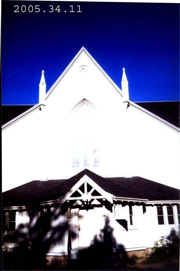 A color photograph of the First Parish Church. Looking at the vestry door with the JL Chamberlain window above it. See 2005.34.11.a for negative.