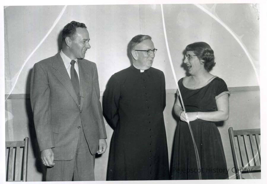 Black and white photograph of a reception honoring The Rev. J. Walter MacFarlane, St. Charles Church. L to R Leo Cloutier, Rev. MacFarland, Gertrude PeabodyLexicon