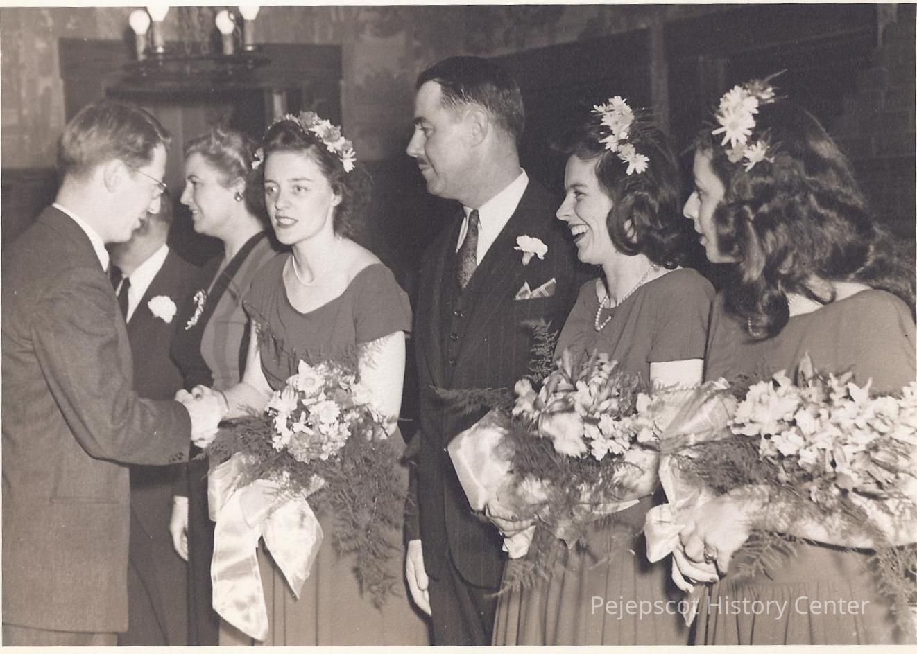 The receiving line at the wedding reception of John R. Chaisson and Marguerite H. Martin at the Hotel Eagle. The picture shows Jack Baxter shaking hands with Catherine Martin, the bride's sister. 02/22/1946