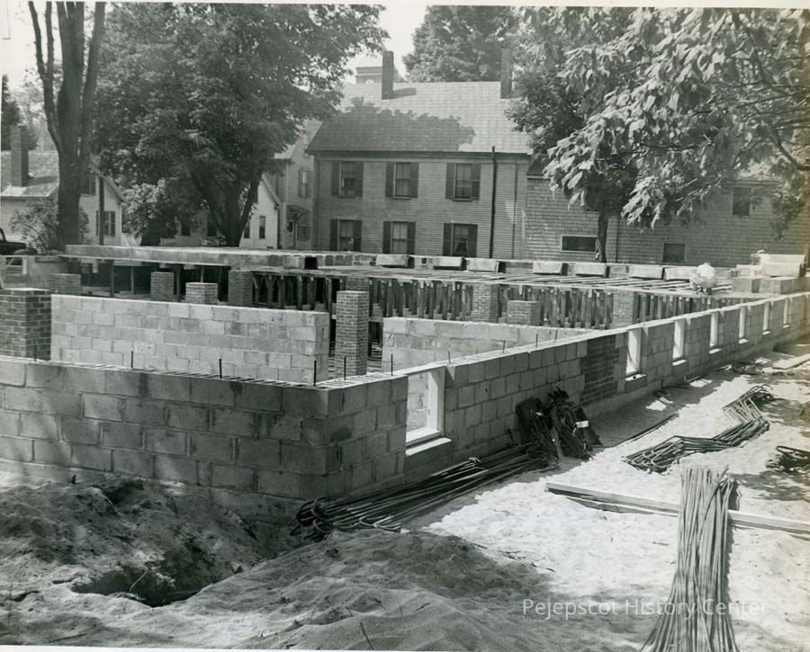 A B/W photograph of the Recreation Center being built at 30 Federal Street. The photo shows Center Street and the Town Hall clock in the background. Undated