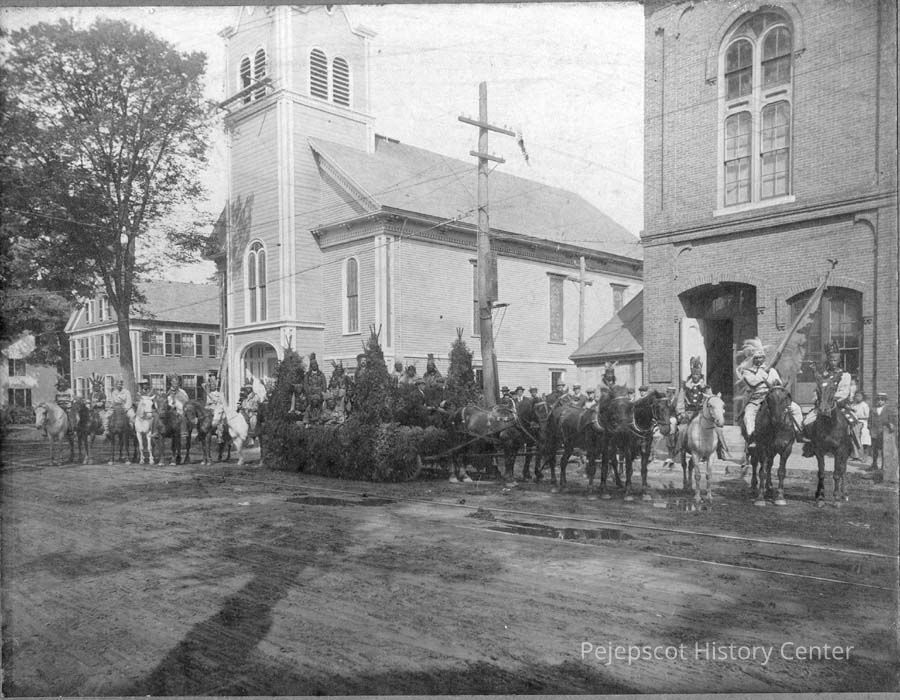 A B/W photographic view of group of Redmen in front of Redman Hall , Pleasant St, Brunswick. They have a horse drawn Christmas float.