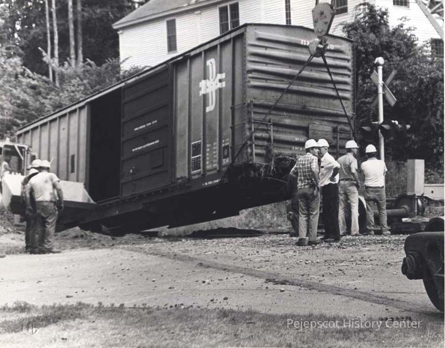 A B/W photograph of a freight car being removed from a wreckage on tracks near the Mall by Fitch Place. The freight car has no wheels. Undated