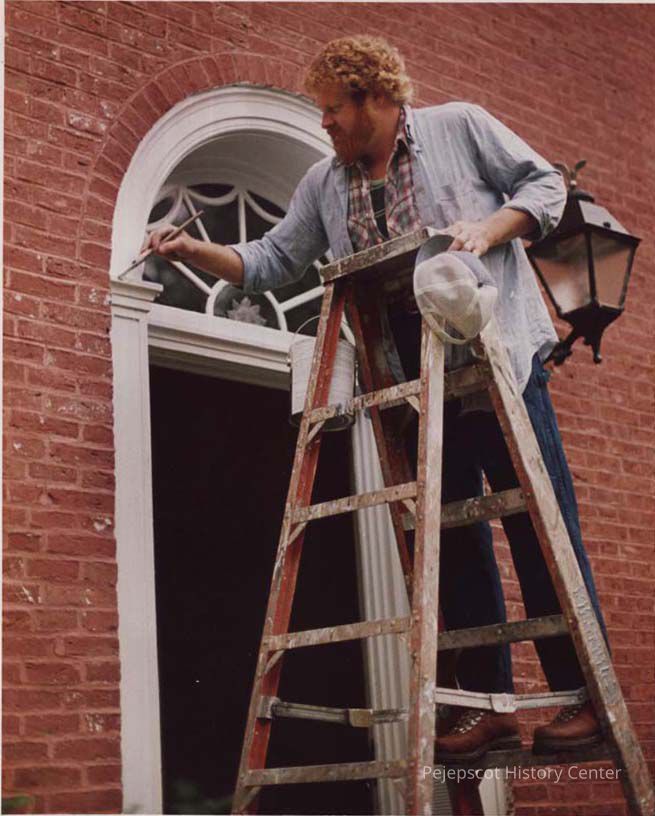 A color photograph of a man painting a window at Bowdoin College. He is stood on a ladder holding a paintbrush in one hand and a baseball cap in the other. This photo was published in the Times Record on 09/25/1987.