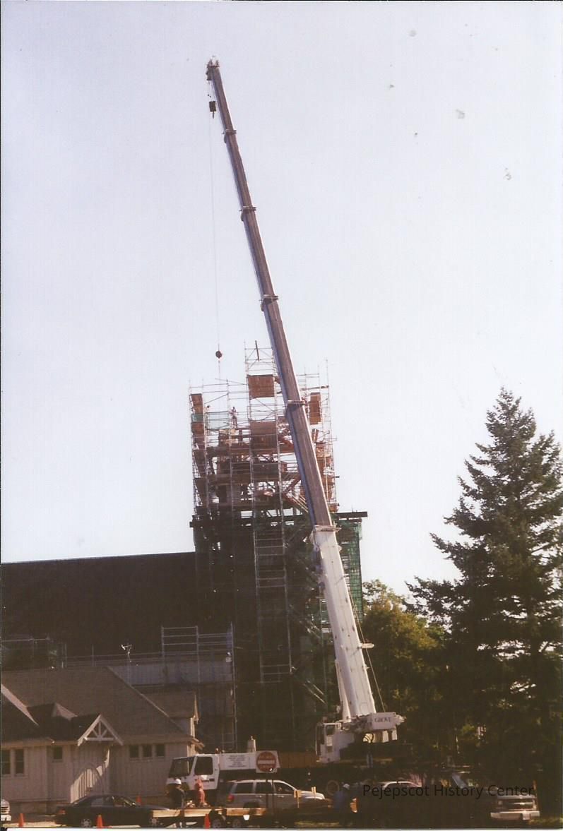 A color photograph of the crane that was used to repair the steeple of the First Parish Church, Brunswick, ME. Undated.
