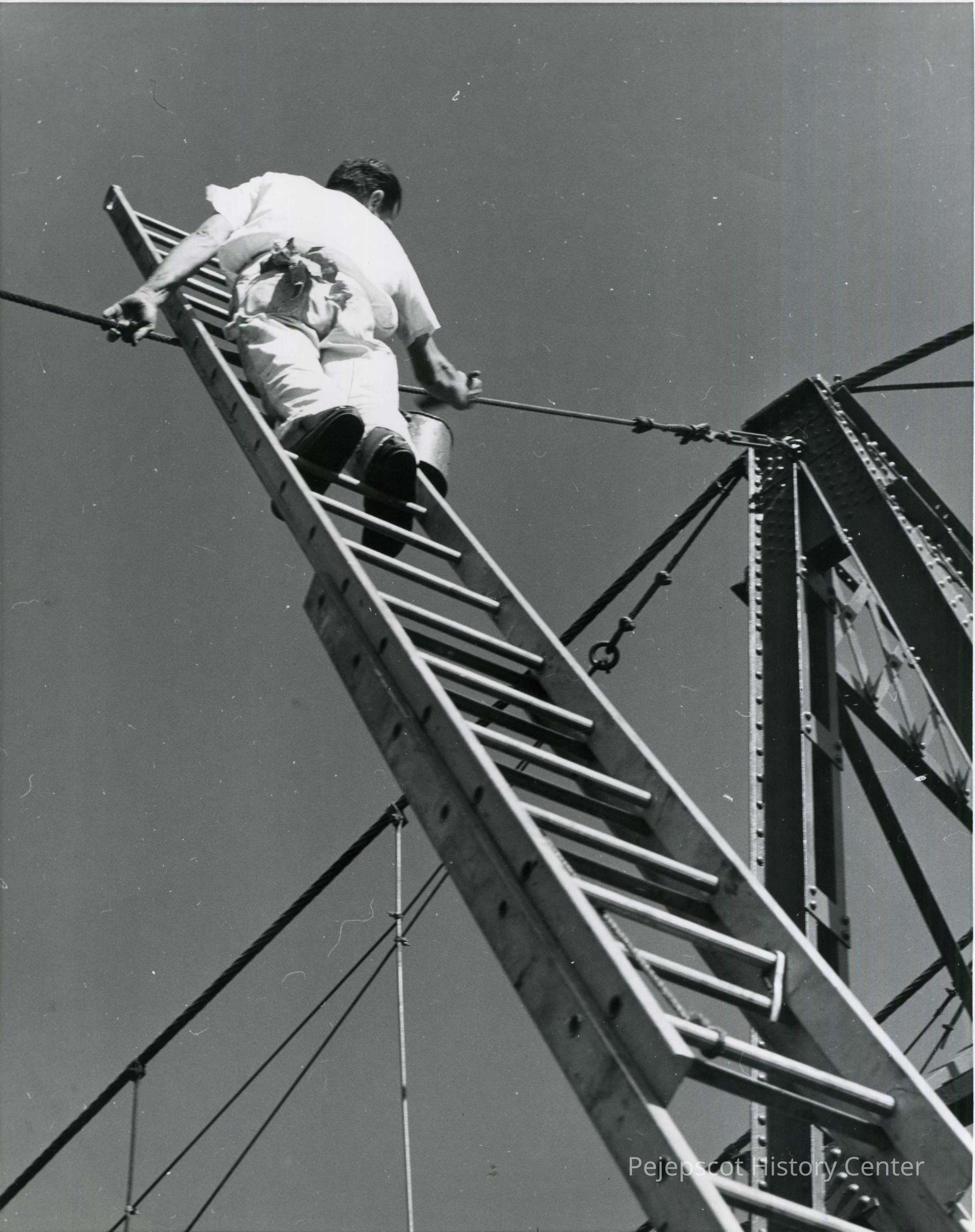 B/W photo of repair work on the Railroad Bridge to fix damage caused by the 1936 flood. 1936.