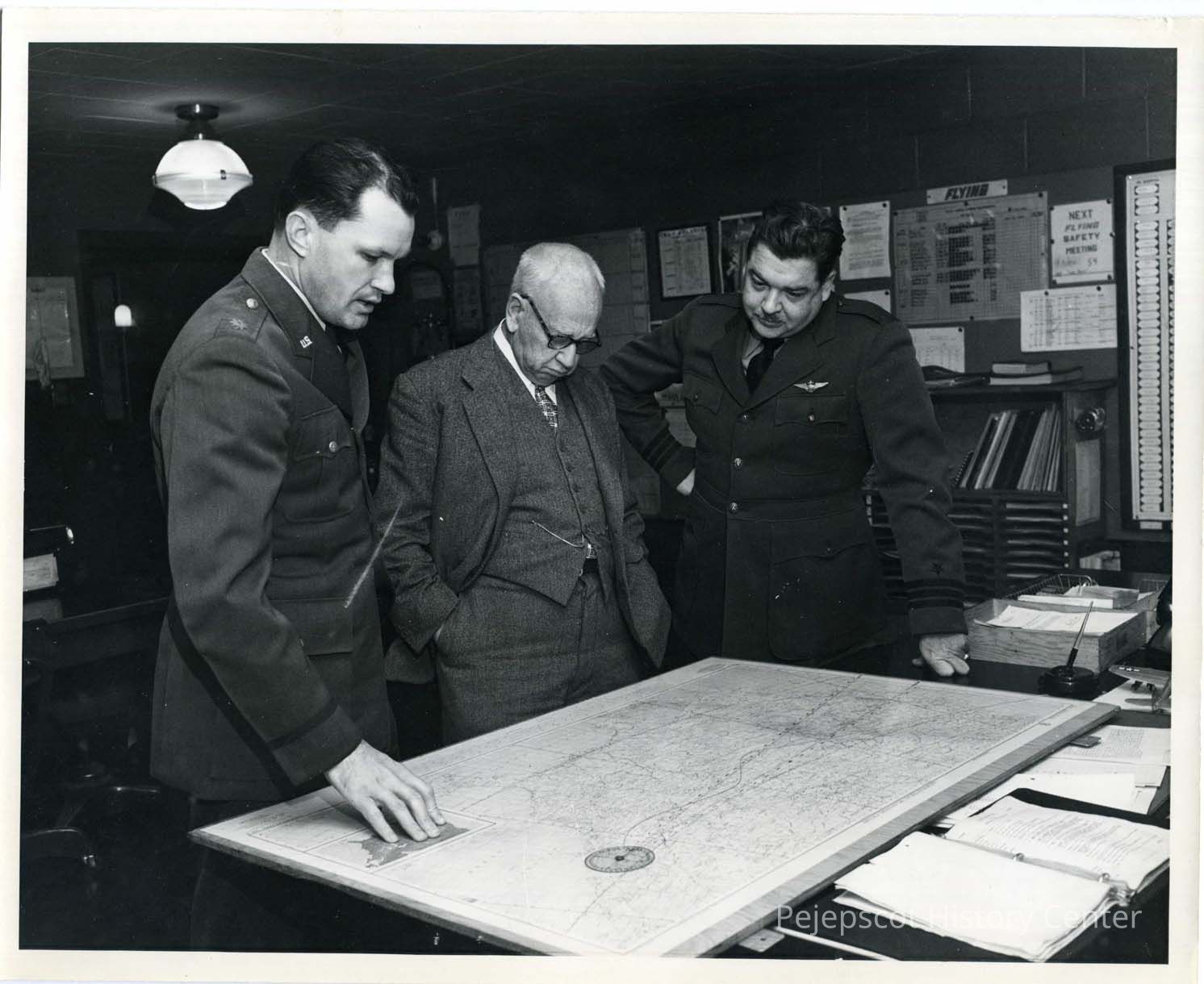 Representative Robert Hale inspecting Air Force and Navy installations at Brunswick Naval Air Station with two unidentified military officers. Undated