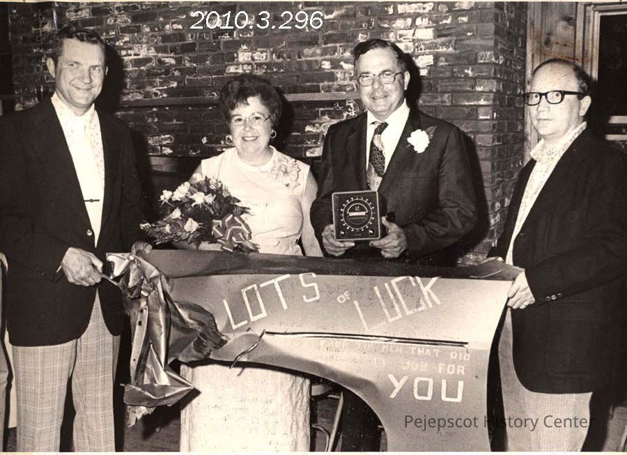 A B/W photograph of Brunswick Police Chief Clemet Favreau with his wife, Theresa, at his retirement party in 1974. Presenting him with a dented fender are Officers Joe Fournier and Ronald Thomason of the the Brunswick Police Association. Favreau served Brunswick Police for 20 years.