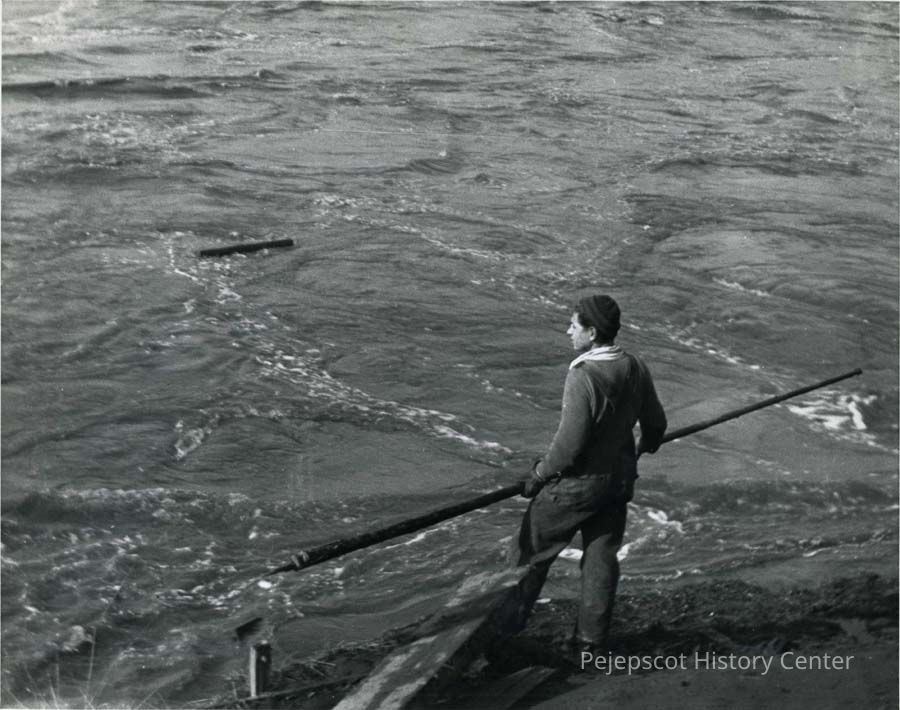 B/W photo of a man with a pick pole catching pulpwood during the 1936 flood. 1936.