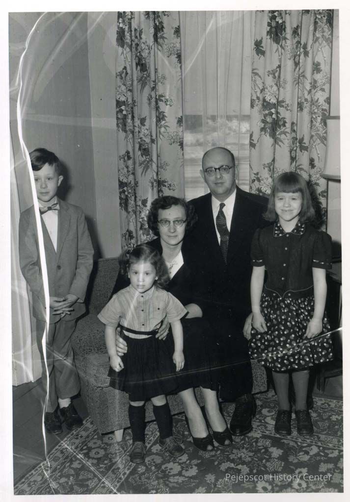 The Rev. Gerald Swetnam (?) pastor of the United Baptist Church in Topsham and his family Mrs. Swetnam is holding their youngest child, Joan Carole age 3. John Arthur age nine stands on the left and his sister Joyce Elaine age 6 is on the right.