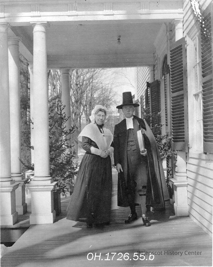 A B/W photograph of Rev. & Mrs. Chauncy Goodrich at the entrance to the Parker Cleaveland House at 75 Federal Street, Brunswick, ME. Photo not dated.