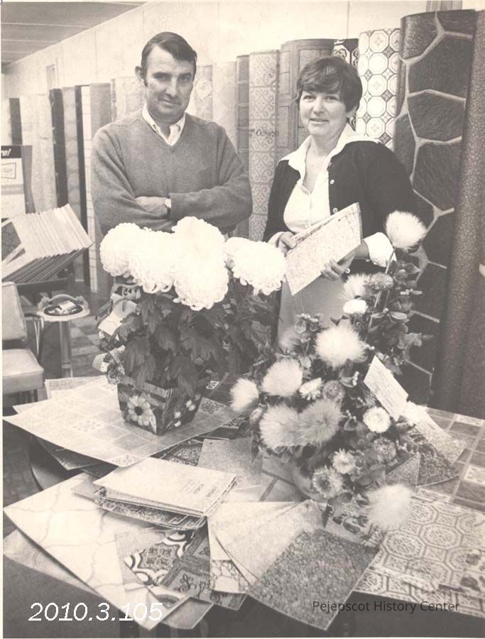 A B/W photograph of Richard and Barbara Carr new owners of Theberge Brothers Inc. a floor covering business on Bath Road. Photo published 10/29/1976. Undated