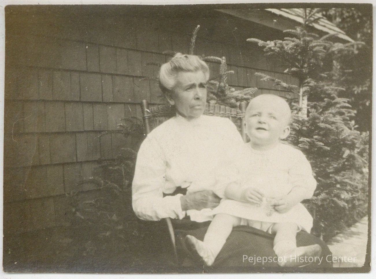 Black and white photograph of an older woman sitting in a rocking chair outside holding a small child. The child is identified as Richard Dennison Wells, also known as Dick Wells, the middle son of Charlotte Chandler Wells. The woman is his grandmother, identified as "Grandmother Chandler."